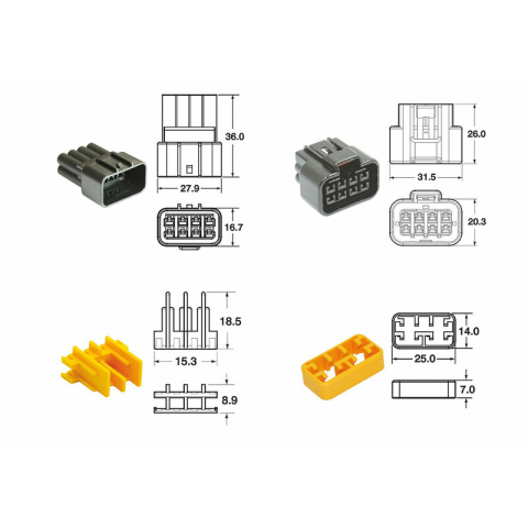 A termék leírása alapján:5 db teljes csatlakozó (tokok, zárak, gumi tömítések, terminálok) szett, szigetelt OEM típus.Technikai részletek:- Férfi és női réz előtinnel bevont terminálok.- Szilikon gumi tömítések.- Működési hőmérséklet tartomány: -40°C / +120°C.- Feszültség esés: 5mV/A.- Szigetelési ellenállás: 100MΩ.- Dielektromos ellenállás: 1000V.- Vezetéktartomány: 0,5mm² / 0,85mm².- Maximális elektromos áram: 10A.