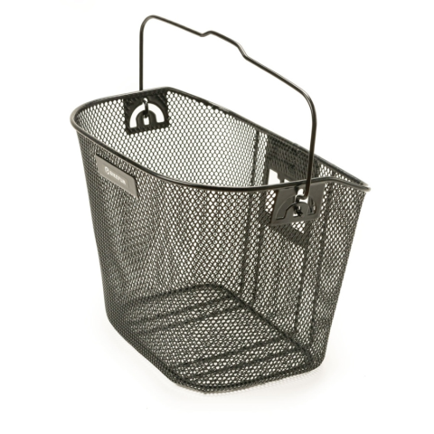 Sűrű szövésű fém első kosár gyorskioldós tartókonzollal. Méretek: 23×26×36 cm • Maximális terhelhetőség: 5 kg. A kosár egy mozdulattal le- és felszerelhető, a tartozék fogantyúval kényelmesen hordozható.