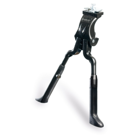 Duplaszárú alumínium kitámasztó, középrészhez (láncvilla összekötő híd) rögzíthető. 24”-28” kerékpárokhoz. Nyitott állapotban a két láb távolsága 320 mm, így különösen stabilan tartja a kerékpárt. Tömeg: 690 g.
