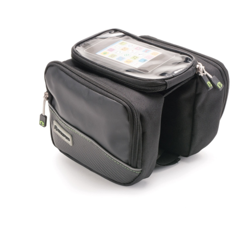 Váztáska. Két oldalsó rekesszel és telefon/GPS tartóval. Alapanyag: 600D poliészter, 420D nylon. Az érintőképernyő kompatibilis, TPU, cipzáras tartóba akár 5,5"-os kijelzővel rendelkező okostelefon/GPS is belefér. Tépőzárakkal a homlokcsőhöz, vagy a nyeregszárhoz is rögzíthető. Fényvisszaverő csíkokkal, és esővédő huzattal. Mérete: oldalanként 17×5×13 cm + középen 9 x 17 cmes telefontartó. Űrtartalom: 2 lK15017Kapcsolódó linkek:http://bikemag.hu/magazin