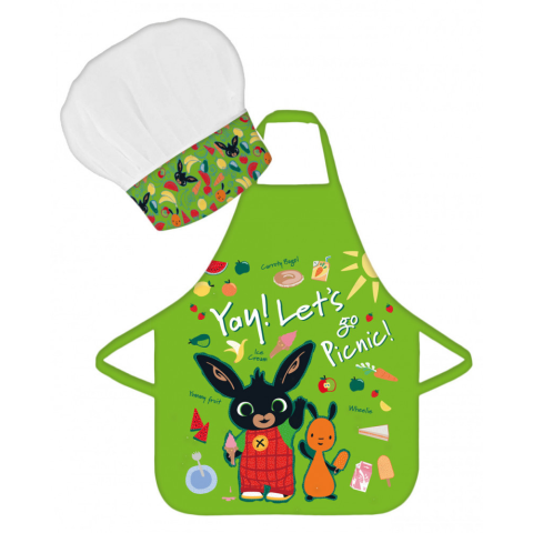 Bing Gyerek kötény 2 darabos szett Anyaga: 100% poliészter Szett tartalma: - 1 db kötény - 1 db kuktasapka Ajánlott 3-8 éves korig. Csomagolt termék, ajándéknak is kitűnő.