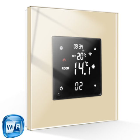 Elegáns, edzett üveglapos smart termosztát a luxus és az intelligens otthontechnológia tökéletes találkozása. Beépített WiFi-vel és okosotthon-kompatibilitással (Amazon Alexa, Google Assistant) könnyedén vezérelhető bárhonnan, akár alkalmazással, akár han
