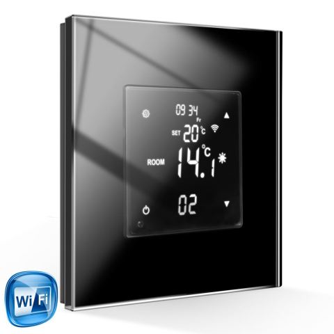Elegáns, edzett üveglapos smart termosztát a luxus és az intelligens otthontechnológia tökéletes találkozása. Beépített WiFi-vel és okosotthon-kompatibilitással (Amazon Alexa, Google Assistant) könnyedén vezérelhető bárhonnan, akár alkalmazással, akár han