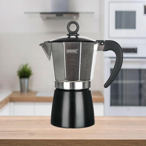 Fém kávéfőző NOIRA, 9 adag, 400ml 49025019- Hagyományos 9 személyes kávéfőző - Házi készítésű, aromás, erős kávét készít - Használhatő gáz, elektromos, kerámia tűzhelyen - Biztonsági szeleppel van ellátva - Anyaga: alumínium, műanyag, rozsdamentes acél, szilikon - Űrtartalom: 400ml - Mosogatógépben nem tisztítható