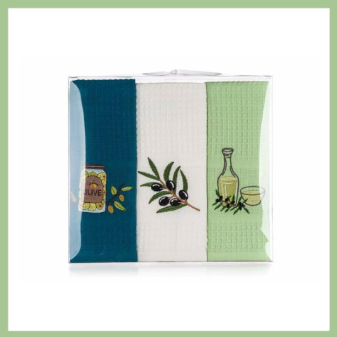 Konyharuha OLIVES 3db, vegyes 10005821- 3 darab dekoratív konyharuha 3 különböző színben és 3-féle olivás mintával. - Kiváló nedvszívó képességű, finom tapintású.- Törlőruha anyaga: 100% pamut. - Mérete: 70×45 cm. - Szín: zöld, fehér.
