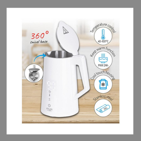 LCD vízforraló AD 1345 whiteLEÍRÁS:• TELJESÍTMÉNY - 1,7L• TELJESÍTMÉNY - 2200W• TELJESÍTMÉNY - 220-240/50-60Hz• KÁBELHOSSZSÁG - 75cm• DUGÓTÍPUS - E/F• MÉRET - 26x22x16CM• SÜTÉSI HŐMÉRSÉKLET BEÁLLÍTÁSA - 40°C | 55°C | 80°C | 90°C | 100°C• A HŐMÉRSÉKLET BEÁLLÍTÁSA MAX. 24H - 40°C | 55°C | 80°C | 90°CJELLEMZŐK:• ROZSDAMENTES ACÉL LAPOS FŰTÉS• KÉTFALÚ HÁZ• ÉRINTŐPAD• VÍZ NÉLKÜLI FŐZÉS ELLENI VÉDELEM• AZ AKTUÁLIS HŐMÉRS