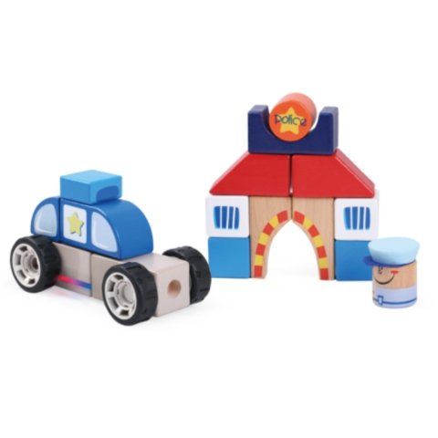 Ezzel a fantasztikus szettel egy színpompás rendőr-kapitányságot építhetnek fel a gyerekek egy figurával és egy rendőrautóval együtt. A fa építőelemek egyedi mintázatuknak köszönhetően remek lehetőséget adnak a gyerekeknek a kreatív és egyben rendkívül szórakoztató munkára. Az egyes fa elemeket a kicsik akár kedvük szerint is variálhatják, így a lehetősé