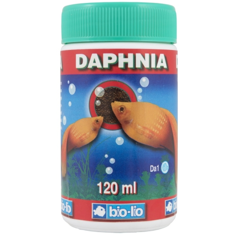 Daphnia (120ml) Speciális természetes haleleség. A Daphnia-k a vízben előforduló bolharákok egyik képviselője. A díszhaltáp tartósítása napon szárítással történik ezért több hasznos tápanyag is megmarad benne károsodás nélkül. Magas a ballasztanyag tartalma kimondottan fogyókúrás táplálék. Naponta többször annyi adható amennyit a halak rövid idő alatt elfogyasztanak.