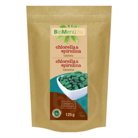 BioMenü bio chlorella és spirulina tabletta 125 g A chlorella egy egysejtű, édesvízi alga, amely nagyon magas arányban tartalmaz klorofillt, továbbá majdnem minden vitamint, ásványi anyagot és aminosavat, amely szükséges az optimális egészség fenntartá
