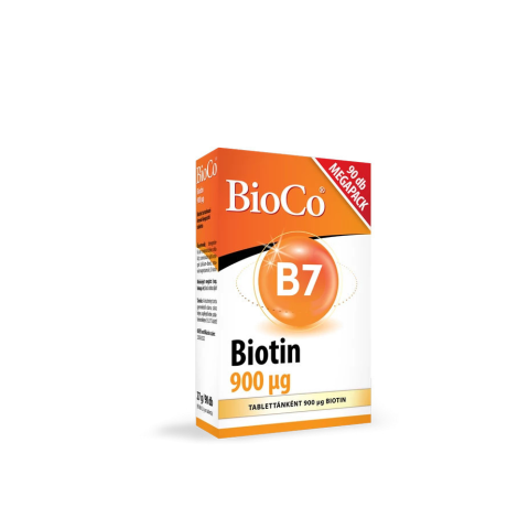 Biotint tartalmazó étrend-kiegészítő tablettaTablettánként 900 µg BIOTIN A BioCo® Biotin készítmény magas dózisban, 900 μg mennyiségben biztosít biotin pótlást, mindössze napi 1 tabletta fogyasztásával.A biotin – másik néven B7-vitamin – egészségre gya