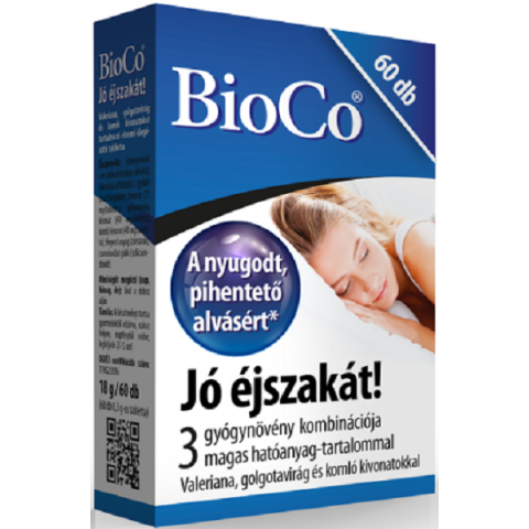 - A BioCo Jó éjszakát készítmény három értékes növényi kivonat kombinációját tartalmazza, az étrend-kiegészítőknél javasolt maximális hatóanyag-mennyiségben.