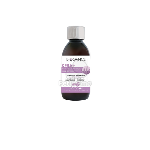 Jellemzők: - A Kera+ omega-3 & 6-ban gazdag halolajat tartalmazó kiegészítő állateledel kutyák és macskák részére, kölyökkutyáknak és -macskáknak 3 hónapos kortól adható. - Ezek az esszenciális zsírsavak hidratáló* és tápláló tulajdonságukkal segítenek a száraz, fakó és töredezett bunda helyreállításában, hogy az ragyogó és fényes legyen. *A bőr felső rétegeit hidratálja. Felhasználási útmutató: Használat előtt alaposan felrázandó. A tábl