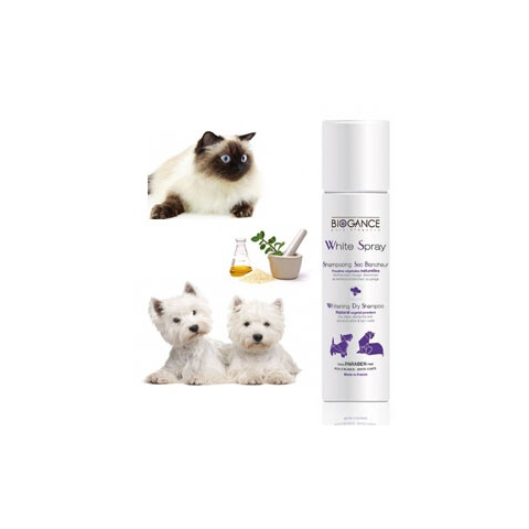 A fehérítő száraz sampon spray természetes növényi eredetű por, mely gyengéden és szárazan tisztít, dezodorál, kiemeli a fehér- és világos szőrzet árnyalatait. magába szívja a szennyeződéseket, a zsírt és a nedvességet. Ideális fürdetések közötti használatra minden bunda típusra. Nem szárítja, és nem irritálja a bőrt. parabén mentes.