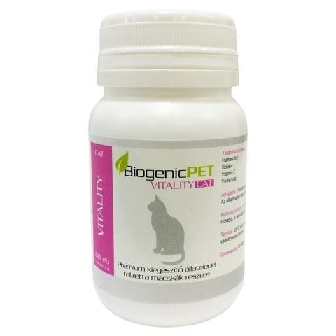 BiogenicPet  Vitality Cat   Vitalizáló regeneráló tabletta macskáknak. Egy olyan, tudományos vizsgálatokkal alátámasztott gyógyhatású készítmény, amely természetes alkotóelemei segítségével szabályozza és visszaállítja a szervezet fiatal korra jellemző gyógyulási képességet, ezáltal természetes úton biztosítja kedvence vitalitását és regeneráló képességét.  A BiogenicPet Vitality Cat aktív hatóanyagai az alábbi problémák kezelésében nyújt hatéko