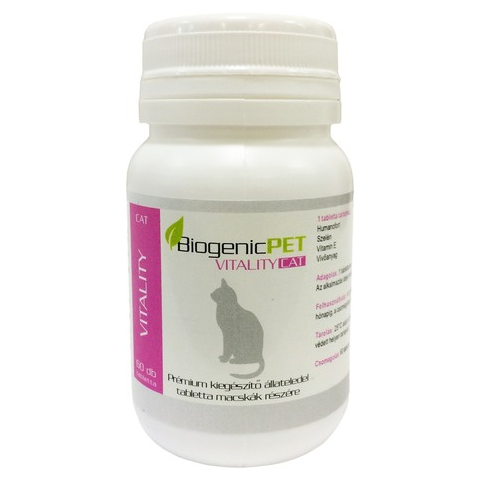 A BiogenicPET Vitality Cat tabletta aktív hatóanyagai révén regenerálja a sérült vagy gyulladt szöveteket, vitalizálja az öregedő sejteket, megvédi a szervezetet a gyulladáscsökkentők káros mellékhatásaitól. Ez egy olyan tudományosan is bizonyított gyógyhatású készítmény, amely természetes alkotóelemei segítségével szabályozza és visszaállítja a szervezet működésének megbomlott egyensúlyát, ezáltal természetes úton biztosítja kedvence vital