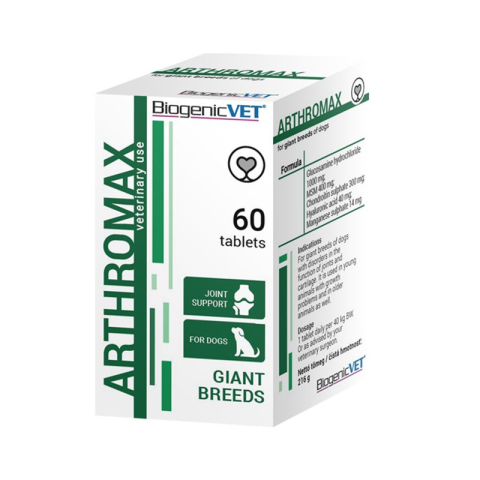 Mi az a BiogenicVet Arthromax Giant Breeds? A BiogenicVet Arthromax Giant Breeds egy speciálisan nagytestű kutyák számára készült ízülettámogató készítmény, amely természetes összetevőivel segíti az ízületek egészségét és rugalmasságát. Miért válaszd a BiogenicVet Arthromax Giant Breeds-t? Segít fenntartani az ízületek rugalmasságát – Támogatja a porcszövet regenerációját. Csökkentheti a fájdalmat és gyulladást – Enyhíti az ízületi problémák