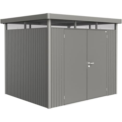 A Biohort fém szerszámosház modern, lapostetős, ipari formatervezők által tervezett termék. 5,6 m2 alapterületével elegendő helyet biztosít a kerti gépek, a kerti bútorok, a sportszerek és játékok, valamint az egyéb kerti eszközök számára. A fémházikó emellett nagyon stabil és hosszú élettartamú. Fém szerszámosház modern felülvilágító ablakokkal és duplaszárnyú ajtóval Az elegendő napfény érdekében a modern fészer akrilüvegből készült felülvilág