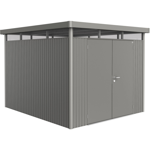 A Biohort fém szerszámosház 7,6 m2 alapterületével elegendő helyet biztosít a kerti gépek, szerszámok, játékok vagy kerti bútorok elhelyezésére. Nagyfokú stabilitásának és kiváló minőségű anyagainak köszönhetően a fém szerszámosház élettartama különösen hosszú. Az ipari formatervezésű lapostető a kerti házat optikailag is feldobja. Modern felülvilágító ablakok és nagyvonalú duplaszárnyú ajtó Felső részén körös-körül modern, akrilüvegből ké