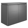 A Biohort HighBoard kerti tárolódoboz egy praktikus kerti fém tárolódoboz. Használható szemetesdobozként vagy kerékpárgarázsként, de időjárástól védett tárolóhelyként is használható grillek, grilleszközök, kerti szerszámok, virágcserepek, játékok, medencetartozékok és még sok más számára. Esővízálló párnatartó doboz A kerti doboz oldalfalai és ajtajai tűzihorganyzott, poliamid égetett lakkozású acéllemezből készültek. Fedele fekete színű porszó