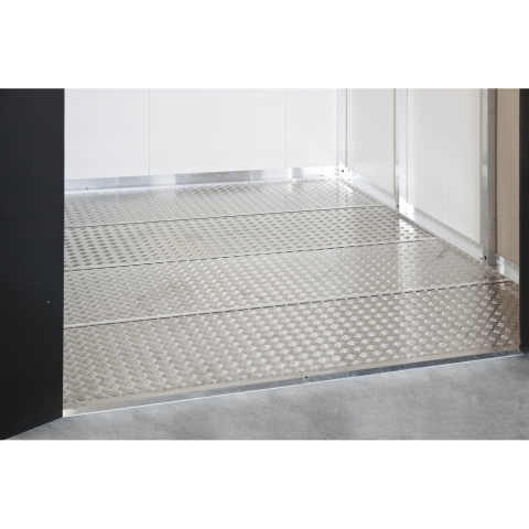 Kiváló minőségű bordázott alumínium lemezpadló, a ház méretétől függően 3-4 szegmensből és összekötő profilokból áll. A fektetéshez alumínium padlókeret szükséges.