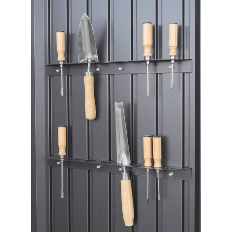 Az ajtószárny belső oldalához. AvantGarde és Highline szerszámos házhoz. Max. 5 szerszámtartó lehetséges ajtószárnyanként. Megjegyzés: az egyszárnyú ajtót és a dekorációs tartozékokat a csomag nem tartalmazza.