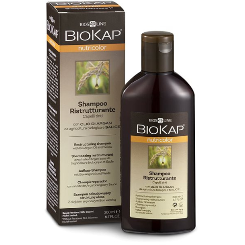 Sampon nők számára - hagyományos sampon, minden hajtípusra ajánlott, dúsító, mélytisztító és erősítő hatás, parabénmentes, szilikonmentes, természetes olaj tartalmú és proteines, 200 ml-es kiszerelésben, Bio kozmetikum, környezetbarát kozmetikum A BIOKAP Nutricolor Shampoo Ristrutturante sampon helyreállítja és védi a sérült vagy rendkívül sérült hajat, nagyon kíméletesen tisztítja és revitalizálja a fejbőrt. A sampont festett hajra vagy fest