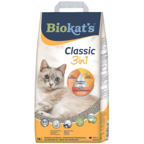 A Gimpet Biokats Classic 3 in 1 csomósodó macskaalom háromféle szemcseméret kombinációjával biztosítja a gyors nedvszívást, erős csomósodást és hatékony szagsemlegesítést. Pormentes és gazdaságos megoldás, amely hosszú ideig frissen tartja cicád alomtálcá