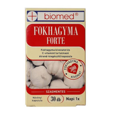 Biomed fokhagyma forte kapszula 30 db Fokhagyma kivonatot és C vitamint tartalmazó étrend-kiegészítő kapszula. A fokhagyma előnyösen befolyásolja a vérzsír- és koleszterinszintet, továbbá hozzájárulhat a keringési rendszer normál működésének fenntartás