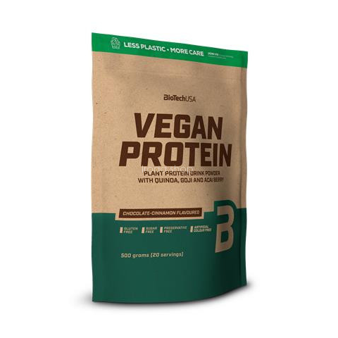 Táplálékkiegészítő, 500g, vegán, BIOTECH USA, csokoládé-fahéj Ízesített, növényi fehérje italpor gojibogyó- és acaibogyó-porral, quinoa liszttel és édesítőszerekkel.