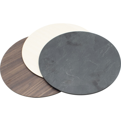 Fekete, kerek Bisetti Arya vágódeszka HPL műanyagból (magasnyomású laminát), pala mintázattal. Átmérő 300 mm, vastagság 5 mm. Tartós és könnyen tisztítható, ideális a mindennapi konyhai használathoz.