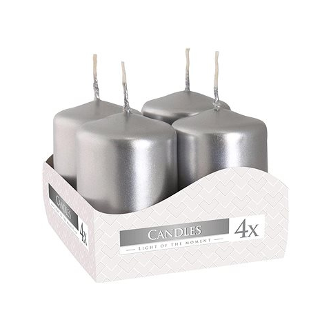 Gyertya készlet - klasszikus, parfümmentes, pamut kanóccal, 4 db-os csomag, magas, anyaga paraffin, ezüst színben, égési idő 7 óra A BISPOL Adventi gyertya, fémes ezüst 4× 60 g gyertya főbb jellemzőiKis méretűek, tökéletesek dekorációs és praktikus célokraAnyaguk paraffin, amely hosszú égési időt biztosítHosszuknak köszönhetően a
