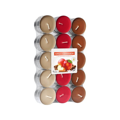 Gyertya - illatos és teagyertyák, ünnepi/karácsonyi illat,, bádogedény, 30 db darabos készlet, kerek alakú, anyaga paraffin, barna kivitel, égési idő 4 óra A BISPOL almás- fahéjas gyertya 30 db fő jellemzőiA BISPOL gyertya ideális aromalámpákban és dekoratív lámpákban való használatraHagyományos pamut kanóccalSúlya 350 g
