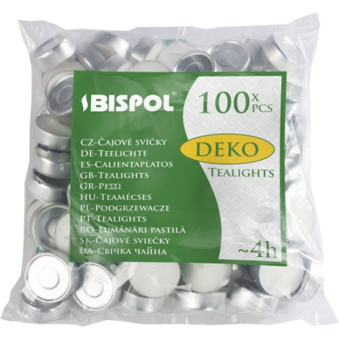 Gyertya készlet - teagyertyák, parfümmentes, pamut kanóccal, edény anyaga bádog, 100 db-os csomag, természetes, anyaga paraffin, égési idő 4 óra A BISPOL teamécses, zacskós, 100 darab gyertyák alapvető tulajdonságaiA BISPOL teamécseseket aromaterápiás lámpákban vagy dekoratív lámpákban használjákKis méretűek, tökéletesek dekorációs és praktiku