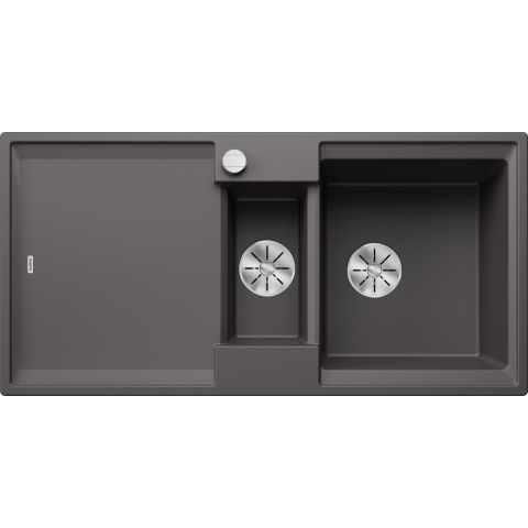 BLANCO ADIRA 6S palaszürke tart., exc. Lefolyógarnitúra helytakarékos csővel, 2 x 3 1/2“-os InFino® szűrőkosár, lefolyó-távműködtető (tekerőgomb) Modern mosogató gyönyörű Silgranit színekben kibővített funkcionalistással Nagyfokú kényelem az XL medenc