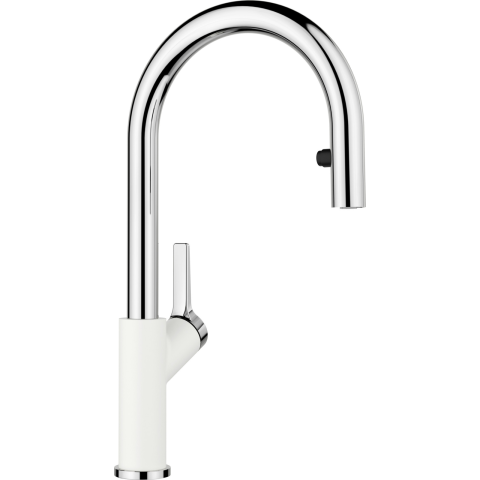 BLANCO CARENA-S Vario fehér/króm HD Klasszikusan modern, prémiumosztályú csaptelep Rejtett, kihúzható zuhanyfej Az ívelt, magas kifolyó megkönnyíti az edények és vázák megtöltését Magasan elhelyezkedő, ergonomikus kezelőkar 190 fokban elforgatható kif
