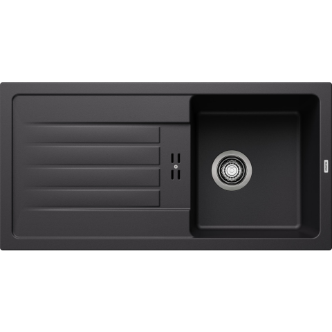BLANCO FAVUM 45 S fekete exc.n. Lefolyógarnitúra helytakarékos csővel, 3 1/2-os szűrőkosaras lefolyó Időtlen, funkcionális kialakítás letisztult vonalvezetéssel. Extra nagy medence és méretes csepegtetőfelület integrált túlfolyóval. Szűk medencerádius
