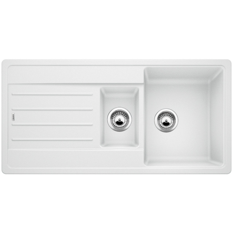 BLANCO LEGRA 6 S fehér tart.nélkül Klasszikus vonalvezetés modern funkciókkal kombinálva. Nagyméretű medencék, csepegtetőfelületek. Elforgatva is beépíthető. Időtlen kialakítás a konyháihoz. Lefolyógarnitúra helytakarékos csővel, 2 x 3 1/2“-os szűrőko