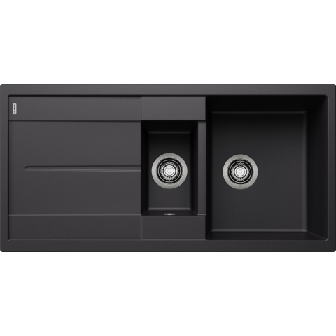 BLANCO METRA 6 S fekete exc. nélkül Lefolyógarnitúra helytakarékos csővel, 2 x 3 1/2“-os szűrőkosárral Fiatalos, egyenes vonalú kialakítás. Vonzó termékcsalád a népszerű szegmensben. A különösen nagyméretű főmedence felülmúlhatatlanul sok helyet bizto