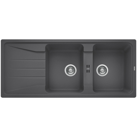 BLANCO SONA 8 S palaszürke exc.n. Lefolyógarnitúra helytakarékos csővel, 2 x 3 1/2'“-os szűrőkosár Modern, egyedi kialakítás Két megegyező méretű tágas medence a kényelmes mosogatáshoz Harmonikusan integrált, süllyesztett kiegészítő kiöntő SILGRANIT®