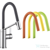 Kompakt és modern csaptelep rugalmas tömlővel és zuhanyfejjel Cserélhető tömlőborítás négy élénk színben A gégecső kényelmesen és biztonságosan a gégecsőtartóra visszaakasztható Oldalsó kezelőkar energiatakarékos hidegindítási funkcióval Kellemes, nyaláb