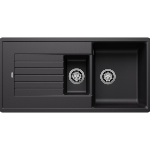 BLANCO ZIA 6 S fekete exc.nélk. Lefolyógarnitúra helytakarékos csővel, 2 x 3 1/2’“-os szűrőkosár. Modern dizájn letisztult vonalakkal. Egyenes külső vonalak, hangsúlyos, keskeny kerettel. A jellegzetes csaptelepsáv keretként megnöveli a csepegtetőfelü