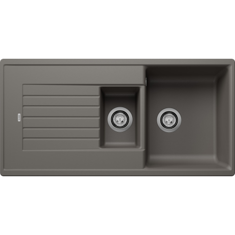 BLANCO ZIA 6 S vulkánszürke tart.nélk. Lefolyógarnitúra helytakarékos csővel, 2 x 3 1/2’“-os szűrőkosár. Modern dizájn letisztult vonalakkal. Egyenes külső vonalak, hangsúlyos, keskeny kerettel. A jellegzetes csaptelepsáv keretként megnöveli a csepe