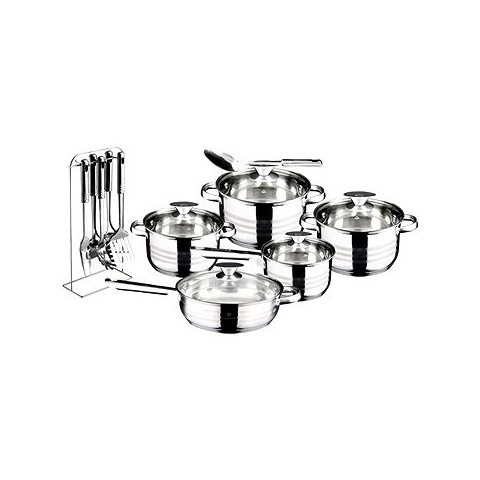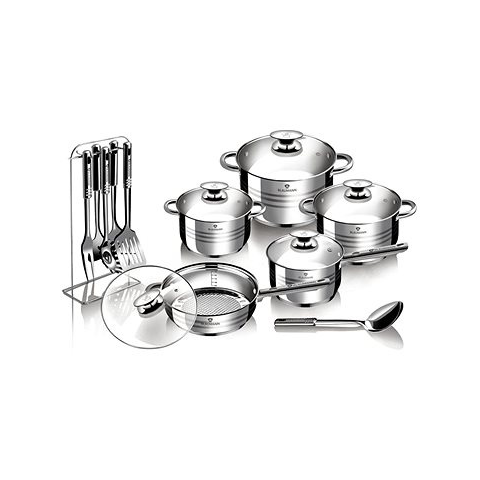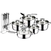 Edénykészlet - gáz, elektromos, indukciós és üvegkerámia főzőlaphoz, 4 fazék és 1 serpenyő a készletben, mosogatógépben mosható, edény anyaga rozsdamentes acél, fazék külső felülete rozsdamentes acél, fazék belső felület rozsdamentes acél, fazék nyelének anyaga rozsdamentes acél, serpenyő belső felülete rozsdamentes acél, serpenyő külső felülete rozsdamentes acél, serpenyő fogantyújának anyaga rozsdamentes acél, forgatólapát, fedő és állvány a cso