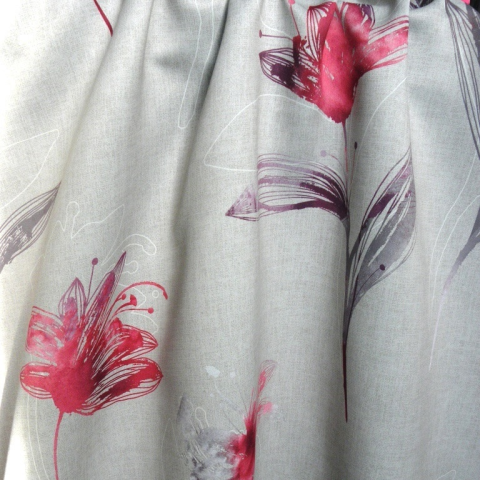 Sötétítő függöny méteráru. 150 cm széles. Legkisebb rendelési mennyiség 1,00 méter. 150 cm széles, dim out sötétítő anyag, alapszíne szürke, szövetmintás, lila virágokkal. Egy oldalon mintázott. Különleges szövéséből adódóan kiváló hatásfokkal söté