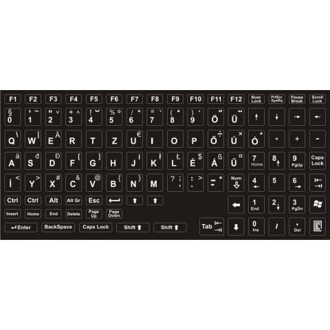 Magyar nyelvű billentyűzet matrica, fekete alapon fehér karakterekkel.Teljes kiosztású, minőségi matrica. A matrica nem foszforeszkál, fényvisszaverő tulajdonsággal bír. Fényforrás nélkül nem világít. Bármely billentyűzettel kompatibilis, kiváló minős