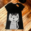 Elején cicás mintával, strasszos, kellemes sztreccses anyag, hosszított. mell:2x38cm hossz:64cm Új, címkés termék.