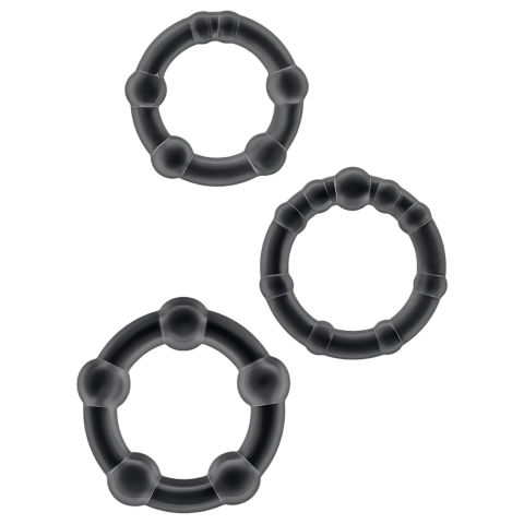 A Stay Hard Beaded Cock Rings szett három különböző méretű gyöngyös péniszgyűrűt tartalmaz, amelyek egyenként vagy együtt is használhatók az erekció fokozására és a korai magömlés megelőzésére.