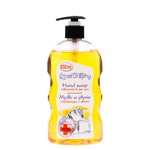 Folyékony szappan antibakteriális citrom és aloe vera Naturaphy 650 mlNaturaphy folyékony szappan kellemes citrom és aloe vera illattal antibakteriális hatásu 650 ml kiszerelésben. A szappan ideális bőrápoló. Alkalmas gyakori használatra és az adagoló pumpának köszönhetően egyszerűen adagolható. A szappan tejsavat tartalmaz, amely hidratál, nem szárítja és nem irritálja a bőrt. Használható munkahelyeken és othonában is. Használati útmutató: Nyomja meg az adag