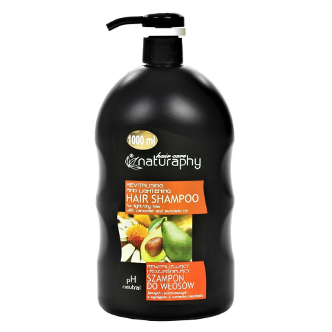 Hajsampon kamilla kivonattal és avokádóolajjal Naturaphy 1000 mlA Naturaphy hajsampon kellemes kamilla és avokádóolaj illattal 1000 ml kiszerelésben. Száraz és világos színű hajra használható. A hajat tisztára mossa, lágyítja és a fejbőrt is tisztán tartja. pH semleges, revitalizáló hatásu és frisseséget biztosít. Könnyen adagolható a flakon tetején található pumpának köszönhetően. Használati útmutató:A kézbe nyomjunk egy adag sampont, törüljük a vizes h