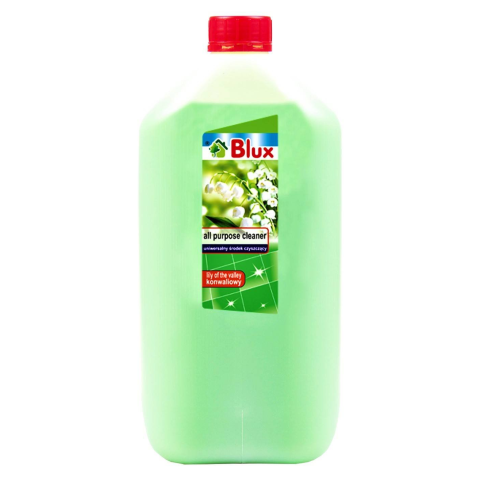 Univerzális padlótisztítószer Blux gyöngyvirág 5000 ml A Blux univerzális padló tisztító 5000 ml kiszerelésben gyöngyvirág illattal nagy felületek tisztítására lett kifejlesztve. Eltávolítja a port és a szennyeződéseket miközben csíkmentes tisztaságot és ragyogást biztosít. Alkalmazása univerzális, használható laminált, lakkozott fa és más felületeken is. Könnyen aplikálható, biztonságos és fénylő hatást biztosít.Használati útmutató:A terméket ön